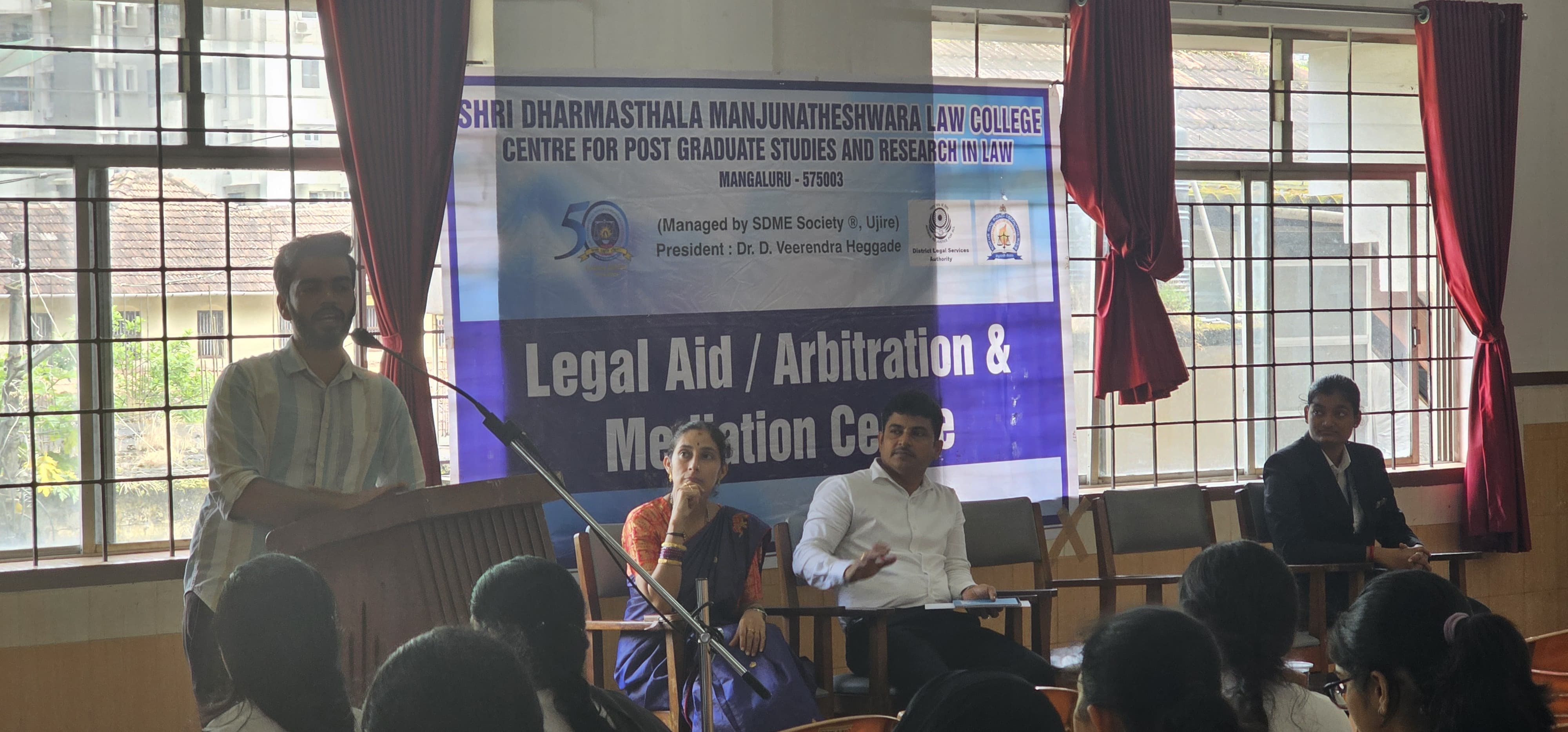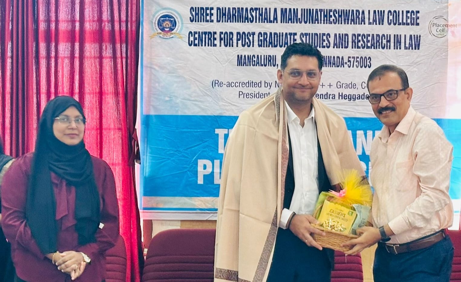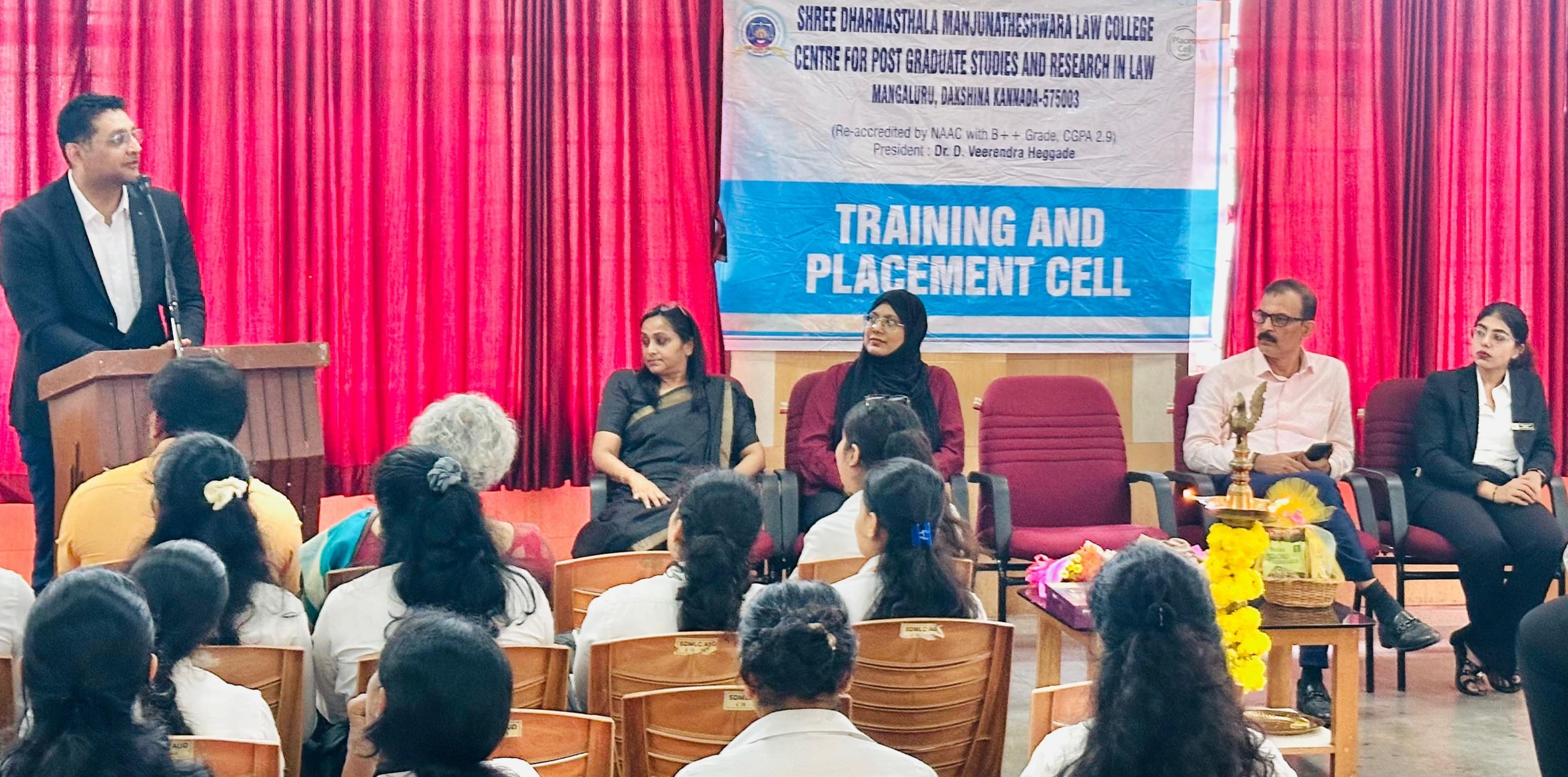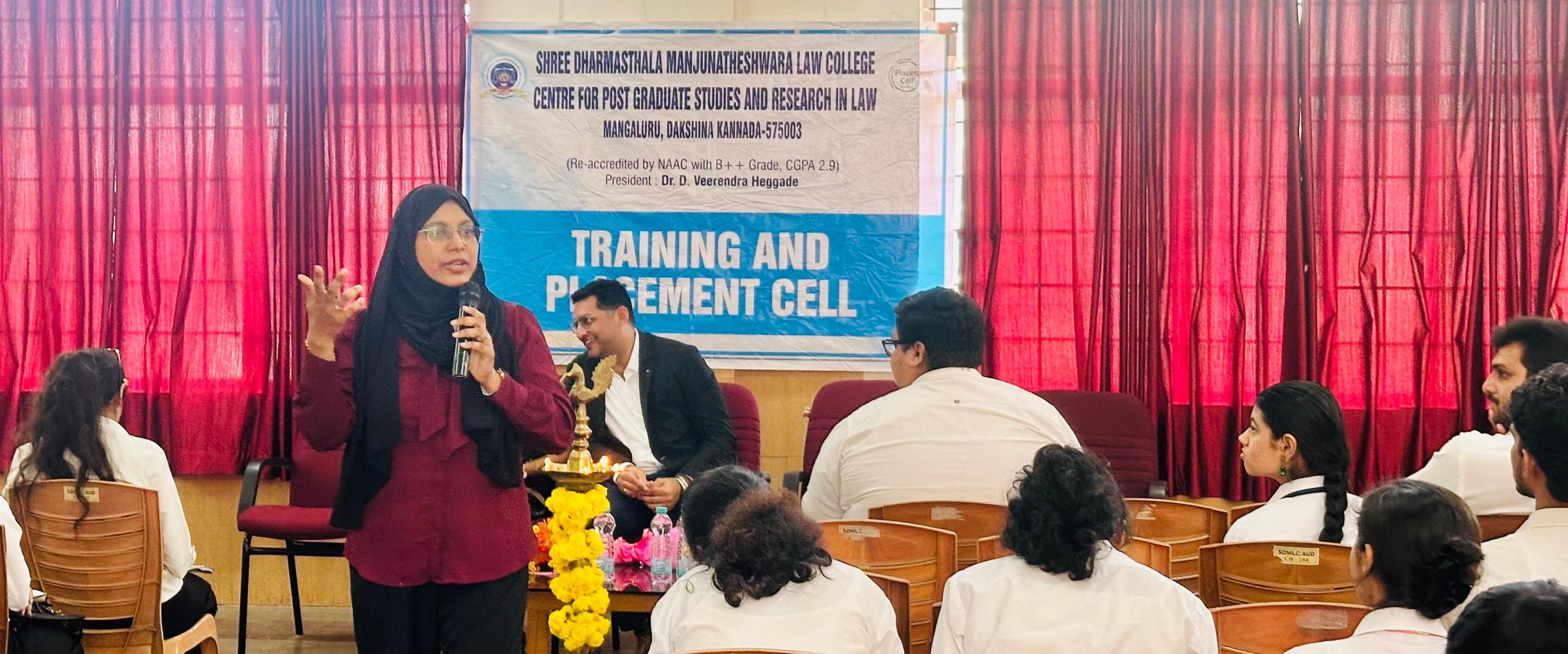 SDM Law College, Mangaluru, organised an Orientation Programme on “Internship, Placement & Higher Education” on September 20, 2025. The programme was conducted by the Training and Placement Cell of the college. The first session was led by Mr. Varun Vinayan, Associate Vice President, Casagrand Premier Buildings Ltd., and a proud alumnus of SDMLC, who inaugurated the programme and delivered an insightful talk on career opportunities and growth in the corporate sector. The second session was conducted by Ms. Shamshad Begum, Team Lead, Edroots International, who guided students on opportunities for higher education abroad.