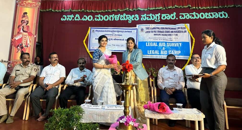 The event was graced by the presence of Adv. H. V. Raghavendra, President, Mangalore Bar Association; Mr. Naresh Malligemadu, Administrative Officer, SDM Mangala Jyothi Integrated School, Vamanjoor; Mr. Ravalendra, Sub-Inspector, Mangaluru Rural Police Station; Mr. Poornachandra, Revenue Inspector, Vamanjoor; Mr. Rajesh, Assistant Engineer, MESCOM; Ms. Malini Rodrigues, Poverty Alleviation Officer; Mr. Pushparaj, NSS Programme Officer; Adv. Shukraj S. Kottary and Adv. Manasa Hegde, Panel Advocates, DLSA Mangalore; and Ms. Sangeetha Nayak, Ex-Corporator, Vamanjoor. Dr. Shubhalakshmi P., Faculty Convenor of the Legal Aid and Extension Cell, welcomed the gathering, while Ms. Anujna Rai S., Student Secretary of the Legal Aid Cell, proposed the vote of thanks. The programme concluded successfully with active participation from students and faculty members.